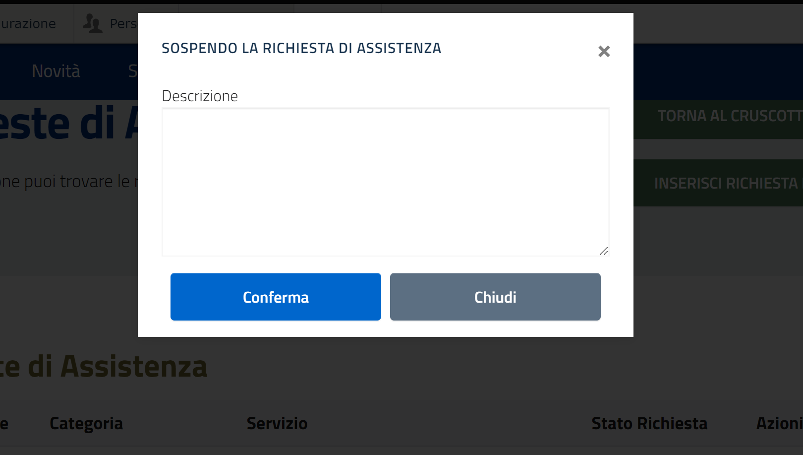 Quando si clicca su un pulsante di Azione, la descrizione della motivazione è sempre obbligatoria tranne quando si clicca sul pulsante "PRENDERE IN CARICO".