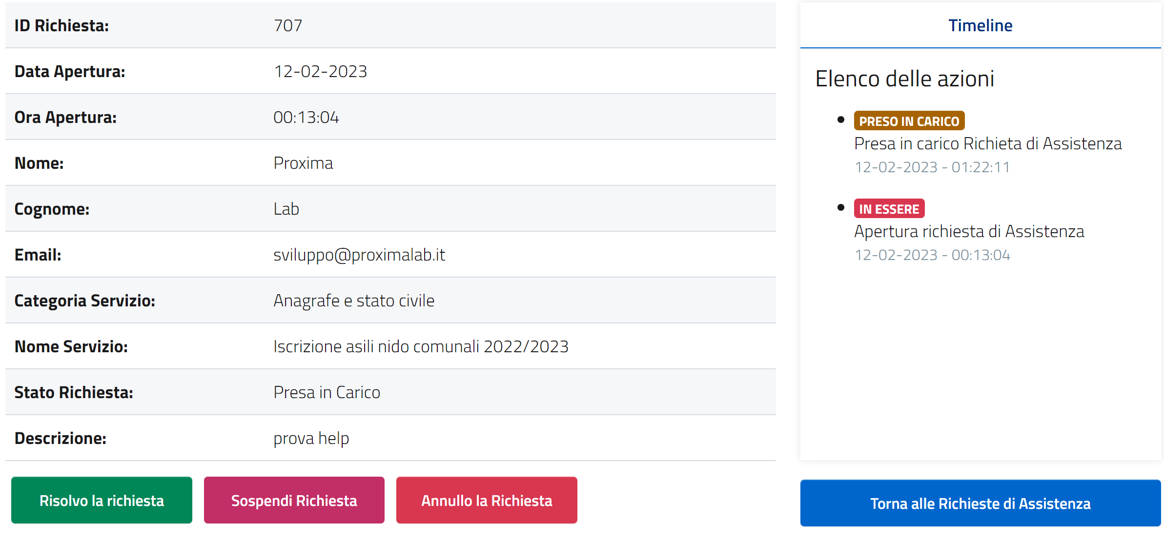 A seconda dello STATO DELLA RICHIESTA compariranno i pulsanti di Azione che si potranno eseguire e nella "TIMELINE" le azioni intraprese fino a quel momento. Cliccando sulle Azioni presenti