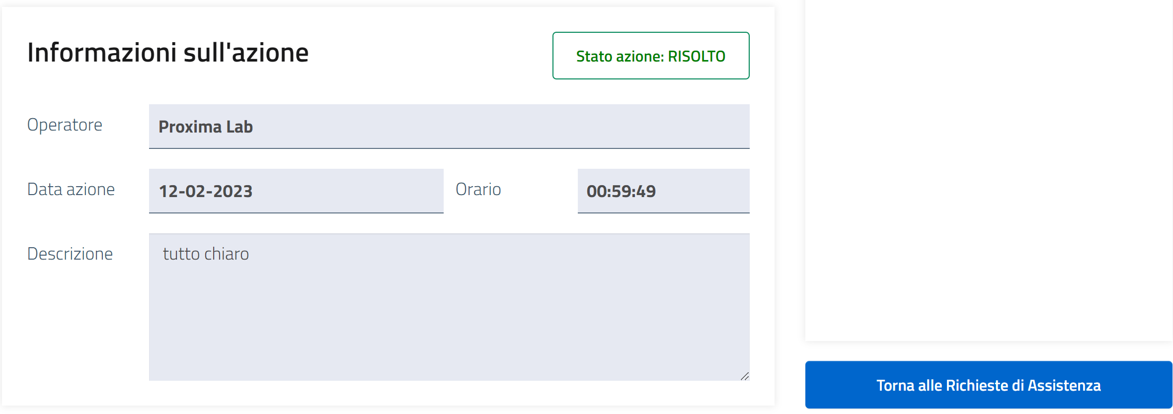 Cliccando sul pulsante "Torna alle Richieste di Assistenza" si tornerà alla pagina "ELENCO RICHIESTE DI ASSISTENZA".