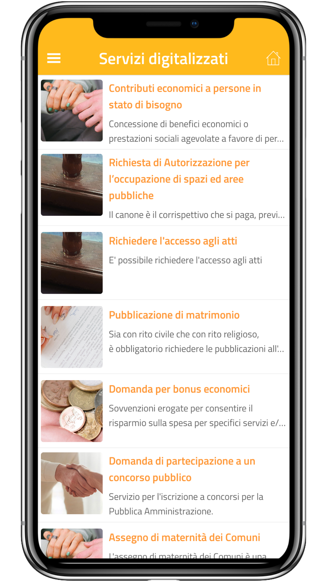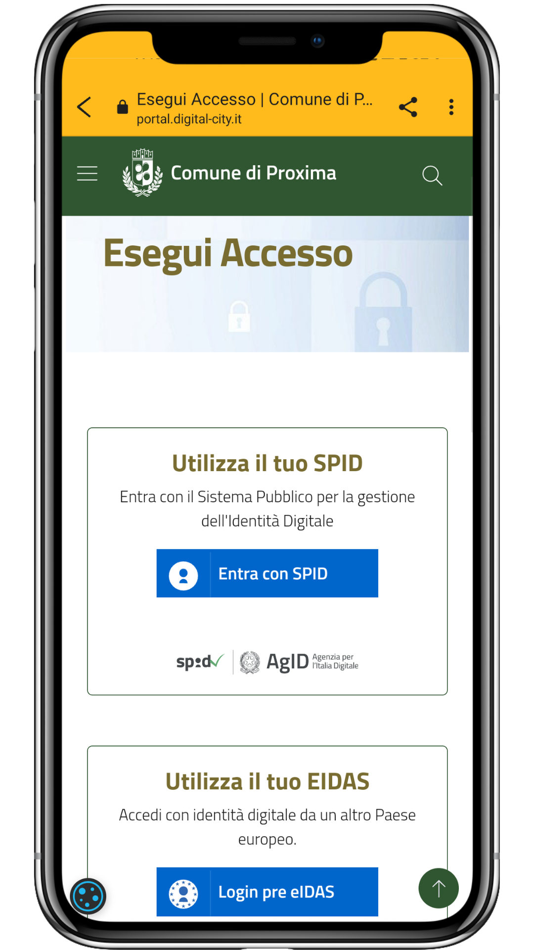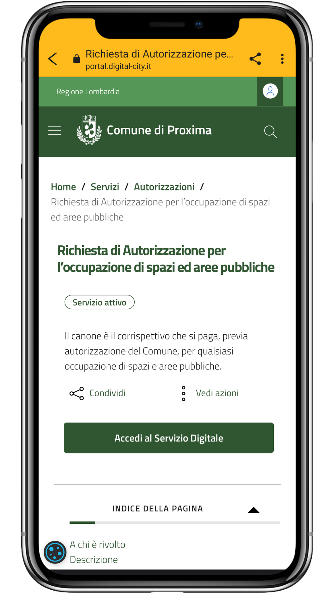 Si accede all'elenco dei servizi che possono essere presentati telematicamente. Tappando su ogni singolo servizio si accede alla descrizione dello stesso, e scorrendo la pagina, tappando su "Vai alla pagina del Servizio" si potrà accedere al servizio digitale, premendo su "Accedi al Servizio Digitale" e loggandosi mediante Spid, CIE o Eidas, tutto direttamente dall'App.