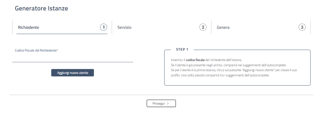 4. Fare nuovamente clic su “Prosegui” e, una volta controllati i dati dell'utente, sarà possibile iniziare l’iter di completamento dell'istanza del servizio selezionato.