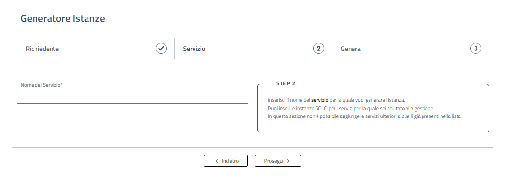 3. Fare clic sul pulsante “Prosegui” e, nella nuova schermata, scegliere il servizio dal menu “Nome del servizio” per il quale si intende generare l’istanza.
