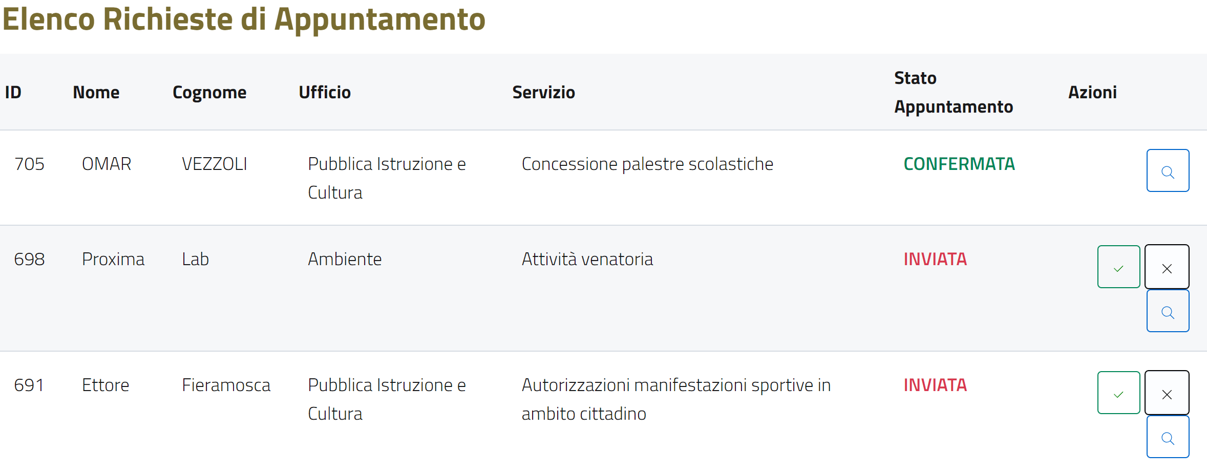 - STATO APPUNTAMENTO: lo stato in cui si trova la richiesta che può essere INVIATA, ANNULLATA o CONFERMATA