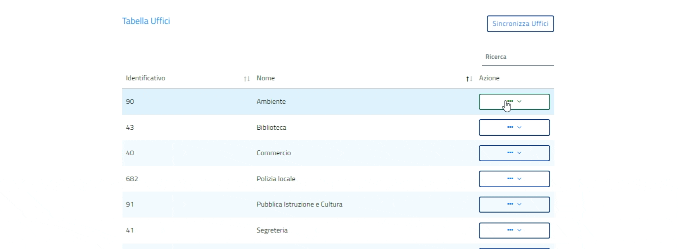 Cliccando sul pulsante "AZIONE" comparirà un menù a tendina con le operazioni da fare per ogni ufficio: