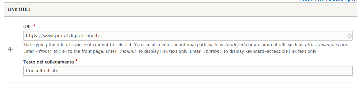 Nel box "Link Utili" inserire l'indirizzo web e il testo che comparirà come nome del collegamento.