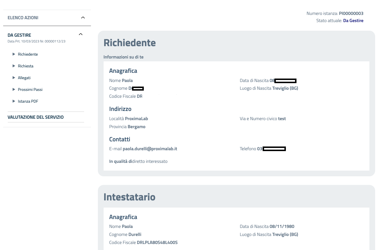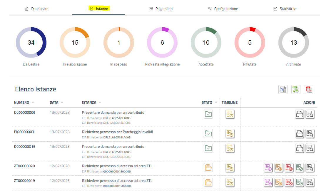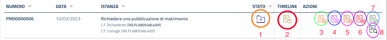 Ogni istanza ha una serie di dati identificativi: numero, data di presentazione, oggetto, stato, timeline e azioni.