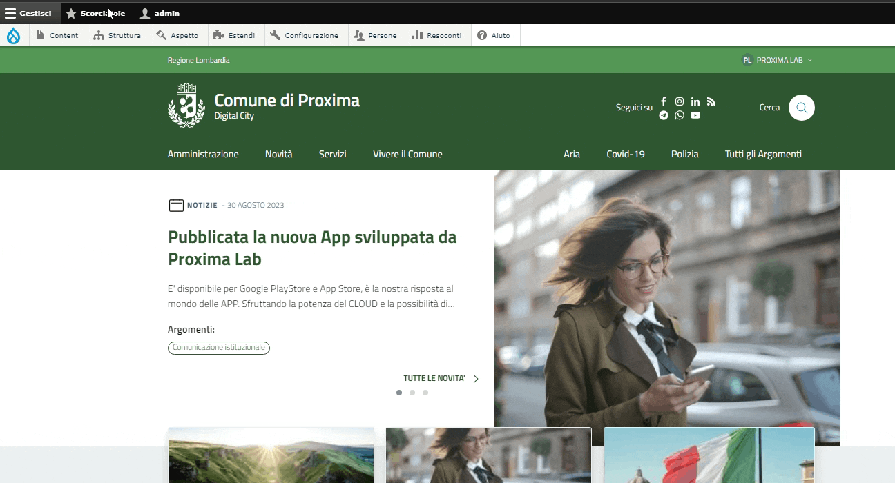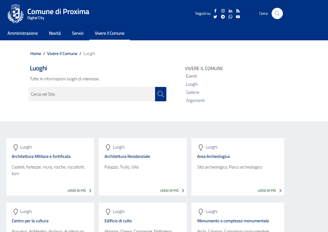Questo contenuto permette di creare pagine dedicate ai luoghi di interesse, quali musei, biblioteche, reperti archeologici, palazzi storici o elementi naturali del proprio comune che verranno pubblicate sotto la voce "Vivere il Comune" del menù principale.