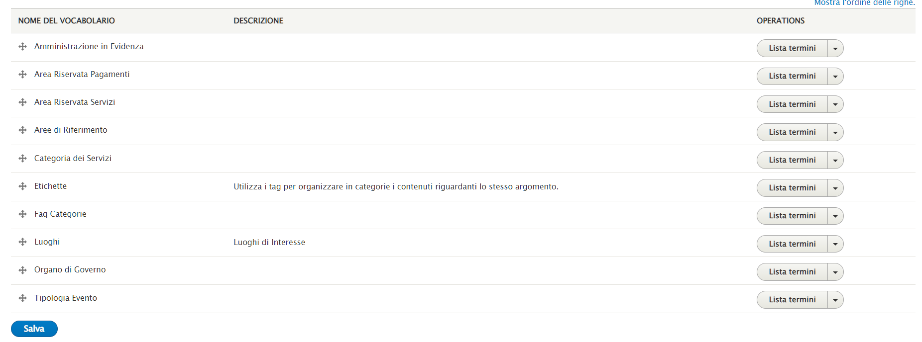 Selezionare la tipologia di contenuto al quale si vuole aggiungere o modificare una voce cliccando su "Lista Termini".