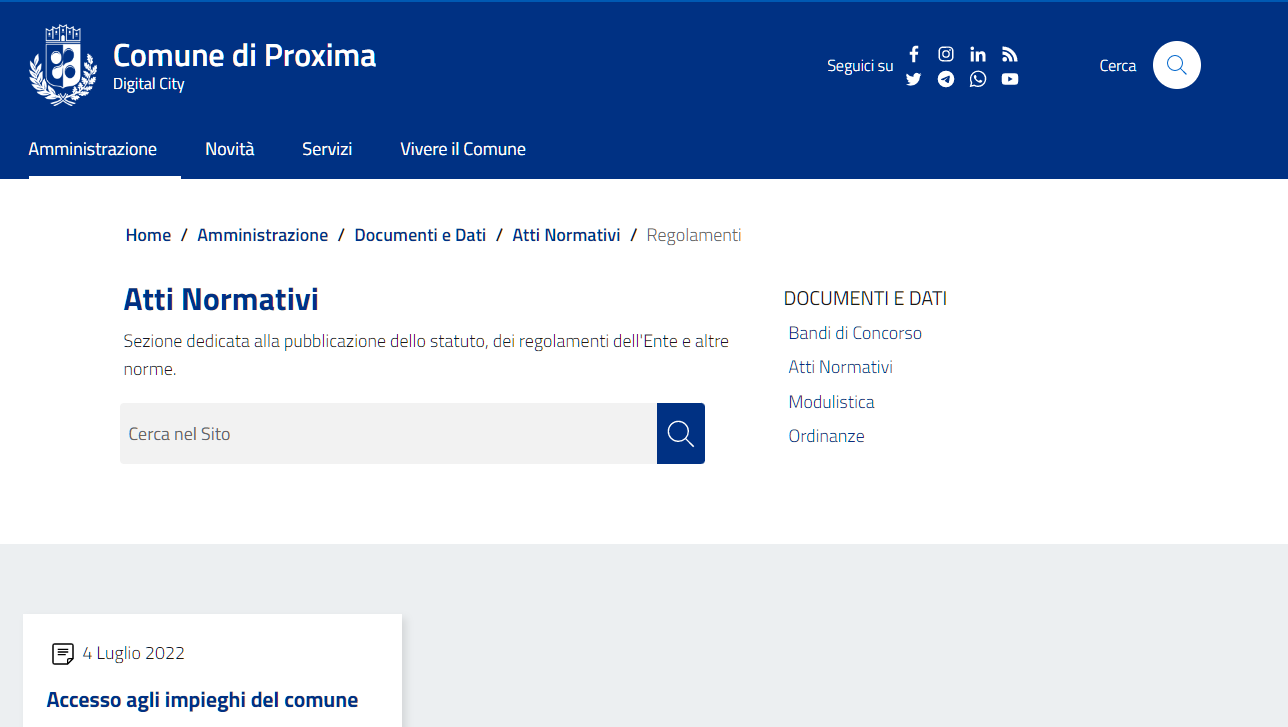 Proprio come per i moduli, questa sezione centralizzata consente il caricamento in un'unica soluzione dei Regolamenti Comunali che potranno poi essere associati alle pagine degli uffici o dei servizi ai quali si riferiscono e alla sezione dedicata in Amministrazione Trasparente.