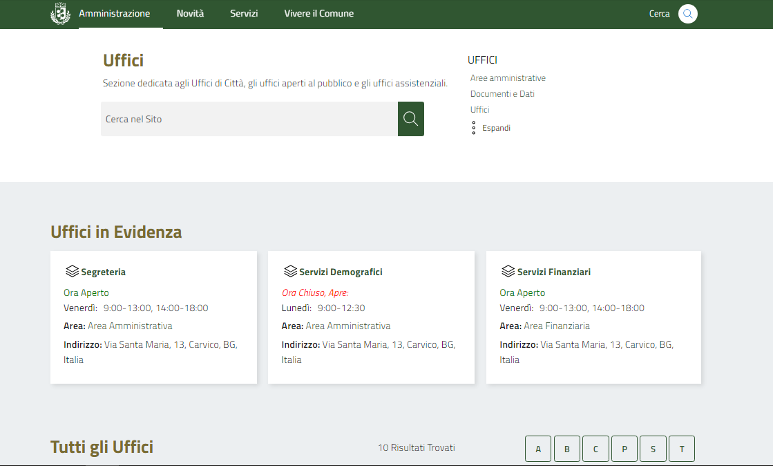 Questo contenuto consente la creazione degli uffici da collegare alle diverse Aree Amministrative del Comune.