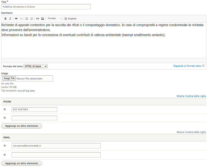 Inserire il Titolo, il Sommario (breve descrizione che comparirà sotto il titolo), l'immagine di copertina e i contatti.