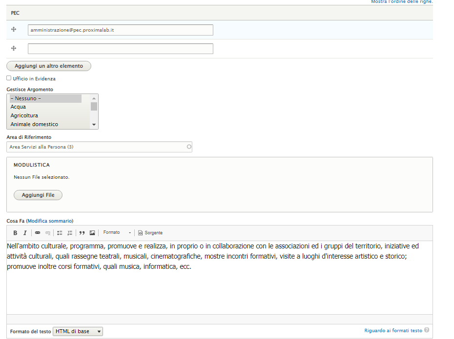 Selezionare l'Argomento di cui si occupa l'ufficio, l'Area di riferimento e i compiti.